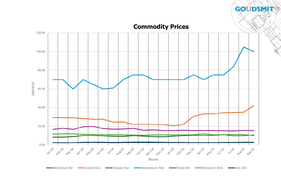 Cobalt recorded a significant increase, rising to $42.13/kg from $35.29/kg in August, extending its strong gains seen throughout Q3. Copper climbed to $10.74/kg, while neodymium eased slightly from August’s spike, averaging $100/kg after peaking at $105/kg.